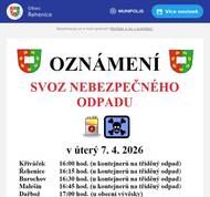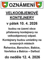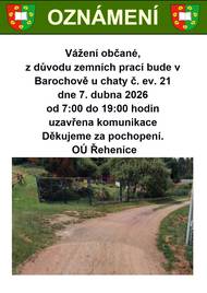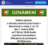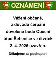 Rehenice: Vazeni obcane, od 27.4. do 30.4. bude uzavren vjezd do chatove oblasti v Babicich. Vice informaci o uzavirce a objizdne trase naleznete na nasich webovych strankach: www.rehenice.cz a obecnich vyveskach. Dekujeme za pochopeni OU Rehenice.