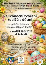 Přijďte si užít kreativní odpoledne s dětmi! Obec Řepiště se sportovní a kulturní komisí Řepiště a se SRPŠ Řepiště vás srdečně zvou na Velikonoční tvoření rodičů s dětmi, které se uskuteční v neděli 29. 3. 2026 od 14:00 ve společenském sále restaurace U Máně v Řepišti. Těšit se můžete na: - drátkování vajíček - zdobení vajíček voskem - malování sádrových zajíčků Přijďte si společně vytvořit krásné velikonoční dekorace a strávit příjemný čas s rodinou. Vstupné: 80 Kč / dítě Těšíme se na vás!