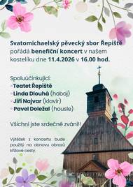 Svatomichaelský pěvecký sbor Řepiště pořádá benefiční koncert v kostele svatého Michaela archanděla v Řepištích dne 11.4.2026 v 16.00 hod. Spoluúčinkující: Teatet Řepiště Linda Dlouhá (hoboj) Jiří Najvar (klavír) Pavel Doležal (housle)