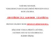 Před 15 dnyDočasné uzavření lékárny v ŘevnicíchŘevnická lékárna bude v nejbližších dnech měnit provozovatele. Z tohoto důvodu bude od 25. března na přechodnou dobu uzavřena pro veřejnost. Doporučujeme proto, abyste si včas zajistili všechny potřebné léky, zdravotnické pomůcky i další přípravky, které pravidelně užíváte. Předejdete tak zbytečným komplikacím v období, kdy nebude možné řevnickou lékárnu navštívit.