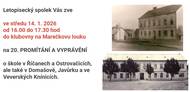 Letopisecký spolek Vás zve ve středu 14. 1. 2026 od 16.00 do 17.30 hod do klubovny na Marečkovu louku na 20. PROMÍTÁNÍ A VYPRÁVĚNÍ o škole v Říčanech a Ostrovačicích, ale také v Domašově, Javůrku a ve Veverských Knínicích.
