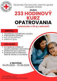 Nasledujúci termín 233 hod. kurz opatrovania začína od 04.05.2026 do 07.06.2026 pre samoplatcov alebo možnosť preplatenia cez UPSVaR v Dunajskej Strede pre UoZ a ZoZ. Pre nezamestnaných platí 30 dní pre začatím kurzu pred nástupom na kurz predložiť UPSVaR tlačivá (do 03.04.2026) Tel. č 031/552 26 8