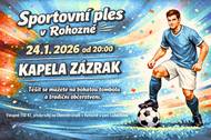 SK Rohozná Vás srdečně zve na Sportovní ples, který se koná v sobotu 24.ledna 2026 od 20.00 hodin v kulturním domě v Rohozné. K tanci a poslechu hraje kapela Zázrak, tradiční občerstvení, bohatá tombola. Vstupné 150,- Kč, předprodej vstupenek probíhá na obecním úřadě. Těší se na Vás sportovci.