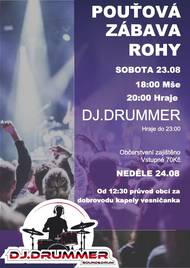 POUŤOVÁ ZÁBAVA ROHY SOBOTA 23.08 18:00 Mše 20:00 - 23:00 hraje DJ.DRUMMER Občerstvení zajištěno Vstupné 70Kč NEDĚLE 24.08 Od 12:30 průvod obcí za dobrovodu kapely Vesničanka