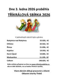 V sobotu 3. 1. 2026 se v naší obci uskutečnila TŘÍKRÁLOVÁ SBÍRKA. V Rokytnici se vybralo 55.020,- Kč. Dohromady s okolními obcemi vybraná částka činí 148.829,- Kč. Všem zúčastněným děkujeme.