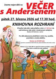 V pátek 27. března jsou zvány děti, třeba i s rodiči a prarodiči, na další Večer s Andersenem v obecní knihovně. Čeká Vás bohatý program, předčítání z knih, promítání, hry a soutěže. Plánovaný konec ve 22.00, občerstvení pro děti zajištěno.