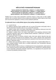 bytovou jednotku 13, K Jídelně 616, o velikosti 1 + 1, výměra 30,60 m2 bytovou jednotku 23, Za Lékárnou 627, o velikosti 1 + 1, výměra 30,60 m2 bytovou jednotku 2, Hornická 643, o velikosti 1 + 2, výměra 63,57 m2 Nabídky adresované na Město Rtyně v Podkrkonoší, Hronovská 431, 542 33 Rtyně v Podkrkonoší, které budou obsahovat identifikační údaje zájemce, prohlášení o akceptaci výše nájemného, důvod žádosti a čestné prohlášení o splnění podmínek výběrového řízení zájemce doručí na podatelnu městského úřadu v uzavřené obálce v levém horním rohu označené nápisem: „Nájem bytu 616/13 - neotvírat“ „Nájem bytu 627/23 - neotvírat“ „Nájem bytu 643/2 - neotvírat“ Informace na tel. 608 768 263, 499 888 163, Jitka Šlechtová