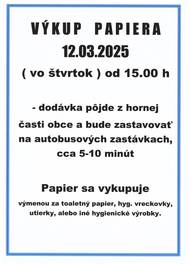 Dňa 12 marca 2026 to je vo štvrtok bude prebiehať výkup papiera od 15hod. Dodávka pôjde z hornej časti obce a bude zastavovať na autobusových zastávkach, kde sa zdrží približne 5-10 min. Papier sa vykupuje výmenou za toaletný papier, hyg. vreckovky alebo utierky.
