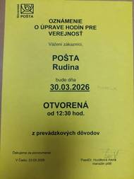 Slovenská pošta pobočka v Rudine dáva do pozornosti zmenu hodín pre verejnosť.