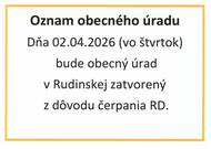 Dňa 02. 04. 2026 to je vo štvrtok, bude obecný úrad v Rudinskej zatvorený.