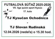 Dňa 12. apríla 2026 to je v nedeľu odohrajú naši futbalisti 17. kolo, kde bude súperom TJ Kysučan Ochodnica. Zápas začne o 15.30 hod na ihrisku súpera. Príďte povzbudiť našich futbalistov, všetci ste vítaní.
