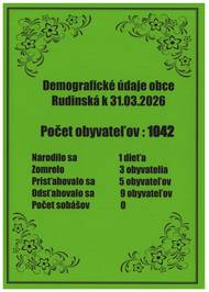Demografické údaje v obci Rudinská k 31.03.2026 sú nasledovné.