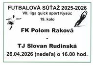 Dňa 26. apríla 2026 to je v nedeľu odohrajú naši futbalisti 19. kolo, kde bude súperom FK Polom Raková. Zápas začne o 16.00 hod na ihrisku súpera. Príďte povzbudiť našich futbalistov, všetci ste vítaní.