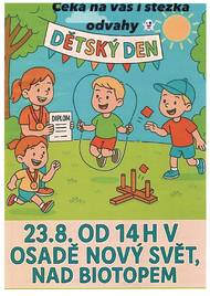DĚTSKÝ DEN V OSADĚ NOVÝ SVĚT NAD BIOTOPEM 23.8.2025 OD 14 HODIN ČEKÁ NA VÁS I STEZKA ODVAHY OD 20:30 PRO MENŠÍ DĚTI A OD 21:00 PRO VĚTŠÍ DĚTI