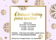Oznamujeme občanom, že obecný úrad bude počas vianočných sviatkov otvorený nasledovne: 23.12.2025 - do 12:00 hod. 31.12.2025 - do 12:00 hod. 2.1.2026 - zatvorené 5.1.2026 - zatvorené Pokladňa - všetky hotovostné platby a platby kartou možné len do 30.12.2025 do 12:00 hod. Zberný dvor a kompostovisko bez obmedzení.
