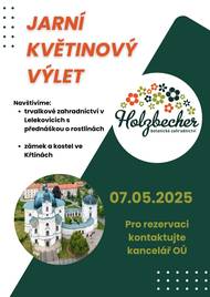 Pozvánka na tradiční jarní výlet. Zase vyrážíme za kytičkama :) Navštívíme trvalkové zahradnictví, zámek ve Křtinách s obědem, a čeká nás komentovaná prohlídka kostela ve Křtinách. Zájemci se mohou registrovat v kanceláři OÚ, cena zájezdu 500 Kč. V ceně je zahrnuta doprava, vstupné a oběd.