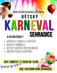 Dětský karneval se koná v sobotu 7. února 2026 od 14:00 v kulturním domě Sehradice. Na programu je spousta zábavy, soutěží a bohatá tombola. Pro nejmenší bude připraven dětský koutek a občerstvení je zajištěno.