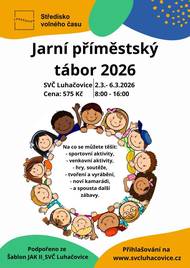 Jarní příměstský tábor 2026 se koná ve Středisku volného času Luhačovice od 2. do 6. března 2026. Program zahrnuje sportovní aktivity, venkovní hry, soutěže, tvoření a možnost navázání nových přátelství. Tábor bude probíhat od 8:00 do 16:00 a cena účasti činí 575 Kč. Přihlašování je otevřeno na ofic