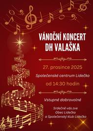 Obec Lidečko a Společenský klub Lidečko vás srdečně zvou na Vánoční koncert DH Valaška, který se uskuteční v sobotu 27. prosince 2025 od 14:30 hodin ve Společenském centru v Lidečku.
