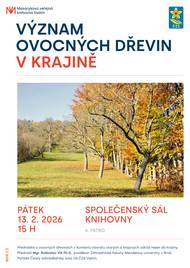 Masarykova veřejná knihovna Vsetín a ÚS ČZS Vsetín zvou na odbornou přednášku Mgr. Radoslava Vlka Ph.D. v pátek 13.2.2026 od 15 hod na téma: Význam ovocných dřevin v krajině ( v kontextu návratu starých a krajových odrůd nejen do krajiny)