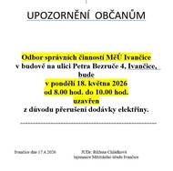 Městský úřad Ivančice oznamuje občanům, že v pondělí 18. května 2026 v době od 08.00 hod. do 10.00 hod. bude v souvislosti s plánovaným přerušením dodávky elektrické energie budova Odboru správních činností, ul. P. Bezruče 4, Ivančice uzavřena.