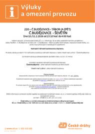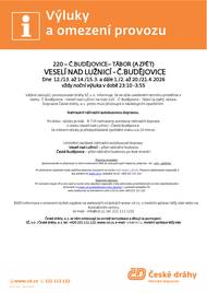 České dráhy oznamují výlukový jízdní řád v úseku Ševětín - Č. Budějovice, na trati 220 - Č. Budějovice - Tábor (a zpět) dne 9. a 10.02.2026 vždy od 9:30 hod do 17:30 hod. a dne 10./.11.02.2026 noční výluka od 23:10 hod do 4:00 hod.