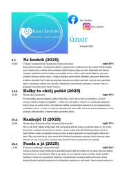 V únoru se promítá: 6.2.2026 Na horách (2025) od 20:00 hodin, 13.2.2026 Holky to chtěj pořád (2025) od 20:00 hodin, 20.2.2026 Ranhojič II (2025) od 20:00 hodin, 28.2.2026 Panda a já (2025) od 17:00 hodi
