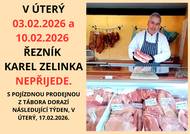 Řezník Karel s pojízdnou prodejnou z Tábora nepřijede 3. a 10. února 2026. Dorazí v úterý, 17.2.2026.