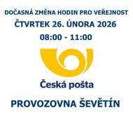 Česká pošta, s.p., oznamuje, že z provozních důvodů dojde ve středu 31. 12. 2025 ke změně hodin pro veřejnost v provozovně Ševětín, viz příloha.