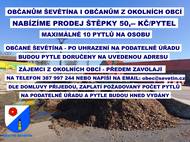 Městys Ševětín nabízí občanům Ševětína i občanům z okolních obcí prodej štěpky 50,-- Kč/pytel. Maximálně 10 pytlů na osobu. Občané Ševětína - po uhrazení na podatelně úřadu budou pytle doručeny na uvedenou adresu. Zájemci z okolních obcí - předem zavolají na telefon 387 997 244 nebo napíší na email: obec@sevetin.cz. Dle domluvy přijedou, zaplatí požadovaný počet pytlů na podatelně úřadu a pytle budou hned vydány.