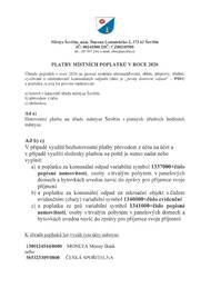 Městys Ševětín zveřejnil stručný výtah z OZV č. 1/2023 (viz Úřední deska-Obecně závazná vyhláška) o přehledu poplatků za směsný komunální odpad v roce 2026, a možnosti jejich úhrady, případně osvobození od poplatků, viz příloha. Městys Ševětín dále upozorňuje majitele psů na ohlašovací povinnost, (tj. přihlášení/odhlášení psa), vůči správci poplatku, kterým je Městys Ševětín, viz Úřední deska-Formuláře. Všichni majitelé psů si i letos mohou bezplatně vyzvednout ekologické sáčky na psí exkrementy v kanceláři městyse.