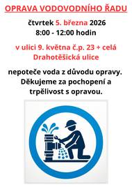 Vážení občané, zítra tj. ve čtvrtek 5. března 2026 od 8:00 do 12:00 hodin se bude opravovat porucha vodovodního řadu v ulici 9. května č.p. 23 + v celé Drahotěšické ulici. Z tohoto důvodu dočasně nepoteče voda. Děkujeme za pochopení a trpělivost s opravou.