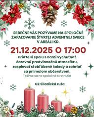 Občianske združenie Siladická ruža srdečne pozýva všetkých občanov na spoločné zapálenie štvrtej adventnej sviece v nedeľu 21. 12. 2025 o 17:00 v areáli kultúrneho domu. Príďte si spolu vychutnať čaro predvianočného času, zaspievať si koledy a stretnúť sa pri malom občerstvení.