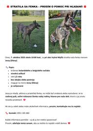 07.10.2025 okolo 10:00 hod. sa pri obci Vyšná Myšľa stratila fenka Jessy. Ide o kríženca holandského a belgického ovčiaka (viď foto), stredná veľkosť, vek 1,5 roka, bez obojka alebo postroja, je začipovaná. Ak ste ju videli alebo máte akúkoľvek informáciu, kontaktujte tel. č. 0951 185 480.