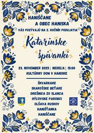 Haniščane a Obec Haniska Vás pozývajú na 2. ročník podujatia Katarinske špivanki, dňa 23.11.2025 /nedeľa/ o 15.00 hod. v kultúrnom dome v Haniske.