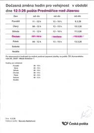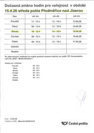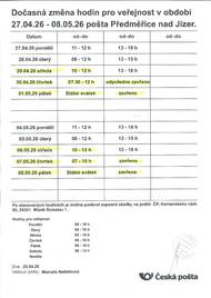 Vážení spoluobčané, upozorňujeme, že z provozních důvodů nebude během odpoledních úředních hodin dne 16.2.2026 v čase 15-17 hodin, fungovat agenda CzechPoint, ověřování listin, ani pokladna. V případě nutnosti zvolte, prosím, jinou pobočku CzechPoint a pro úhradu poplatků jiný úřední den, případně kterýkoli jiný, po předchozí telefonické dohodě. Děkujeme za pochopení! Bc. Tomáš Zach starosta obce