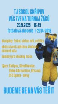 TJ Sokol Skřipov Vás zve na turnaj žáků - fotbalová abeceda r-2014-2016 - tento pátek 23.5.2025 od 16:45. Disciplíny : fotbal slalom, nožičky. Občerstvení zajištěno - pro děti cukrová vata a sladkosti. Těšíme se na Vás. Informace pro příznivce fotbalu - Utkání mužů 24.5. od 15:00 TJ Sokol Skřipov : Budišovice, V úterý 27.5. od 17:00 utkání mladší přípravky Skřipov vs Pustá Polom. Přijďte fandit.