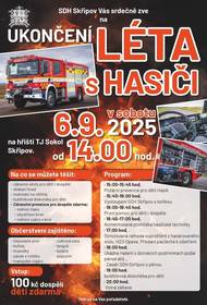 Nezapomeňte již tuto sobotu se koná ukončení léta s hasiči - začátek od 14:00 na fotbalovém hřišti ve Skřipově. Těšit se můžete na zábavné úkoly pro děti i dospělé, malování na obličej, skákací hrad a celým odpolednem Vás bude provázet program s hasičskou tématikou. Skvělé občerstvení je připraveno. Těší se na Vás pořadatelé.