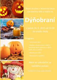 V pátek 26.9.2025 Vás školní družina a mateřská škola zvou na DÝŇOBRANÍ od 16:00 v areálu školy, akce se uskuteční za každého počasí. Dýni, nožík a dobrou náladu s sebou :-)