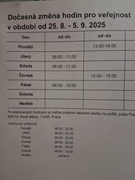 Dočasná změna hodin pro veřejnost od 25.8. - 5.9.2025 Pondělí: 13:00-18:00 Úterý: 08:00-11:00 Středa: 08:00-11:00 Čtvrtek: 12:00 - 15:00 Pátek: 08:00-10:00