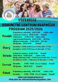 Komunitní centrum Krápníček nabízí kurzy a kroužky pro děti a dospělé. Více na info na www.centrumkrapnicek.cz.