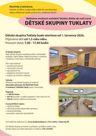 Před 12 dnyObec Tuklaty otevírá novou Dětskou skupinuOd 1. 7. 2026 se v obci Tuklaty otevírá nová Dětská skupina Tuklaty, ve které jsou k dispozici volná místa. Více informací naleznete v přiloženém letáku.