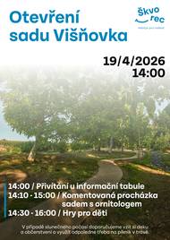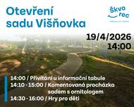 Před 9 dnySlavnostní otevření VišňovkyZveme všechny milovníky přírody na slavnostní otevření upraveného sadu Višňovka, které proběhne v neděli 19. 4. 2026 od 14 hodin. PROGRAM: 14:00 - 14:10 - Přívítání u informační tabule v dolní části sadu 14:10 - 15:00 - Komentovaná procházka sadem vedená ornitologem a přírodovědcem Mgr. Grünwaldem 14:30 - 16:00 - Jrní hry pro děti na stanovištích rozmístěných v sadu - skákání gumy, házení kroužků, kroket, Kubb, petanque a další V případě slunečného počasí doporučujeme si vzít deku a občerstvení a odpoedne využít třeba na piknik v trávě.