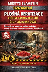 V úterý 21. dubna 2026 se v městysu Slavětín uskuteční plošná deratizace. Návnady na hlodavce budou umístěny ve všech objektech v majetku městyse, s cílem zlepšit hygienické podmínky a zajistit bezpečnost obyvatel.