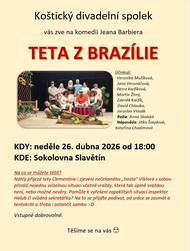 Koštický divadelní spolek vás srdečně zve na komedii Teta z Brazílie, která se uskuteční v neděli 26. dubna 2026 od 18:00 ve Sokolovně Slavětín. Na jevišti se představí Veronika Mužíková, Jana Verunáčová, Petra Karfiková, Martin Žitný, Zdeněk Karfik, David Chlouba a Jaroslav Vlasák.