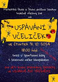 Mateřská škola a školní družina Slavkov srdečně všechny zve na "USPÁVÁNÍ VČELIČEK". Ve čtvrtek 31.10.2024 v 18.00 hod. Sraz u sportovní haly s lucernou nebo lampiónem. Kostým vítán :)