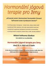 Místní knihovna Slavkov Vás srdečně zve na přednášku "HORMONÁLNÍ JÓGOVÁ TERAPIE PRO ŽENY", která se koná v úterý 15.4.2025 od 17.00 hod v knihovně. O této úžasně promyšlené a fungující sestavě pro ženy bez rozdílu věku Vám přijde popovídat certifikovaná lektorka Magda Semelová. Vstup zdarma.