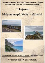 Místní knihovna Slavkov, Obec Slavkov a ČSOP Pantoflíček zvou všechny zájemce na cestopisnou besedu "Tchaj-wan". Beseda se uskuteční ve středu 18. března 2026 v 18 hodin v místní knihovně a vyprávět o svých zážitcích přijede Václav Dušek.