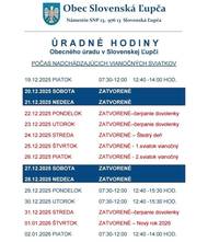 Zmena úradných hodín Obecného úradu v Slovenskej Ľupči počas nadchádzajúcich sviatkov.hr ukázať príspevok na a href="https://www.facebook.com/576136354517748/posts/1436761978455177"b style="color: blue;"Facebook Obec Slovenská Ľupča/b/a img src="https://data.slovenskalupca.sk/_pocitadlo_titulka.php?id=2de3ea9790c59b482ab43eac99f512fe"