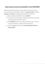 Vedúca školskej jedálne oznamuje, že poplatok za stravu je možné uhradiť od 25.08.-28.08.2025 v čase od 7:00-13:30 hod. Vydávanie stravy začína od 01.09.2025 pre stravníkov MŠ, zamestnancov a cudzích stravníkov. Od 02.09.2025 sa bude strava vydávať už aj pre žiakov ZŠ.